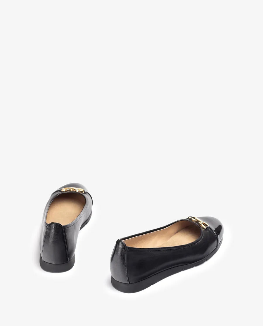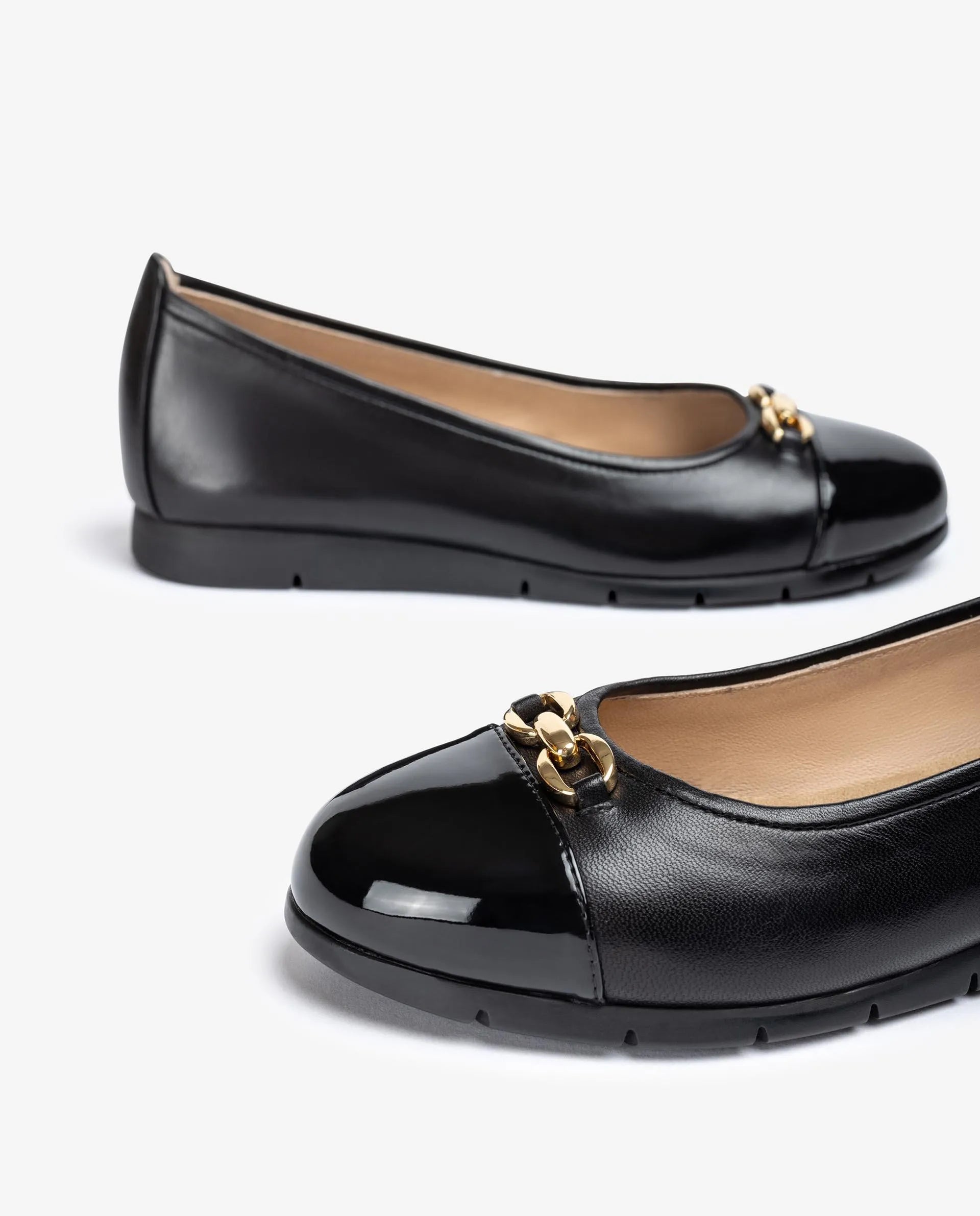 Mary-Jane flat ballerinas with square toe. Made of patent leather Double strap with buckle on the instep. Lightweight, flexible and non-slip rubber sole. A comfortable and versatile model to wear every day.