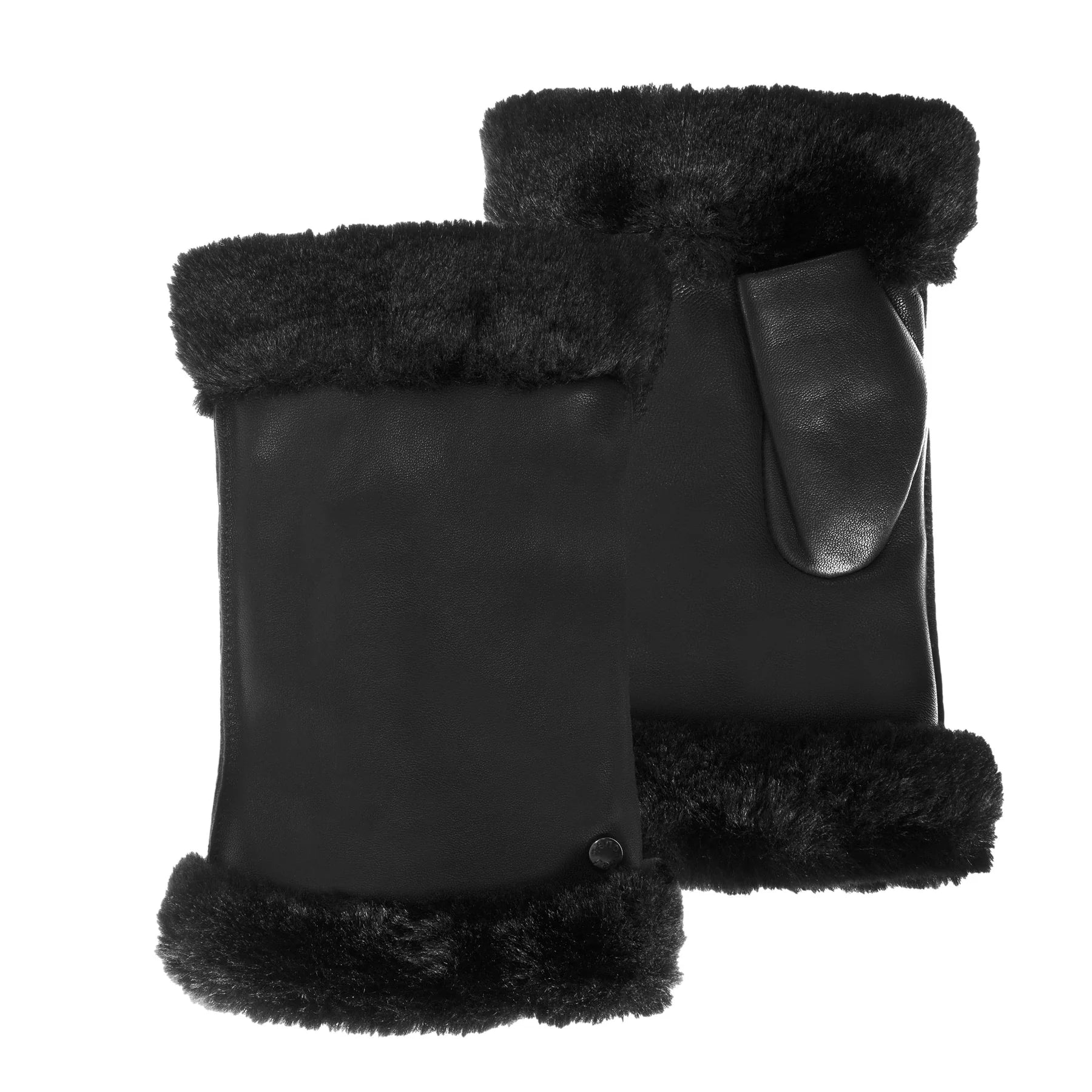 Parfait pour un look chic et cocooning, ces mitaines noires en cuir d'agneau pleine fleur sont doublées fausse-fourrure. Ses bords en fausse-fourrure noirs apportent douceur et chaleur.
