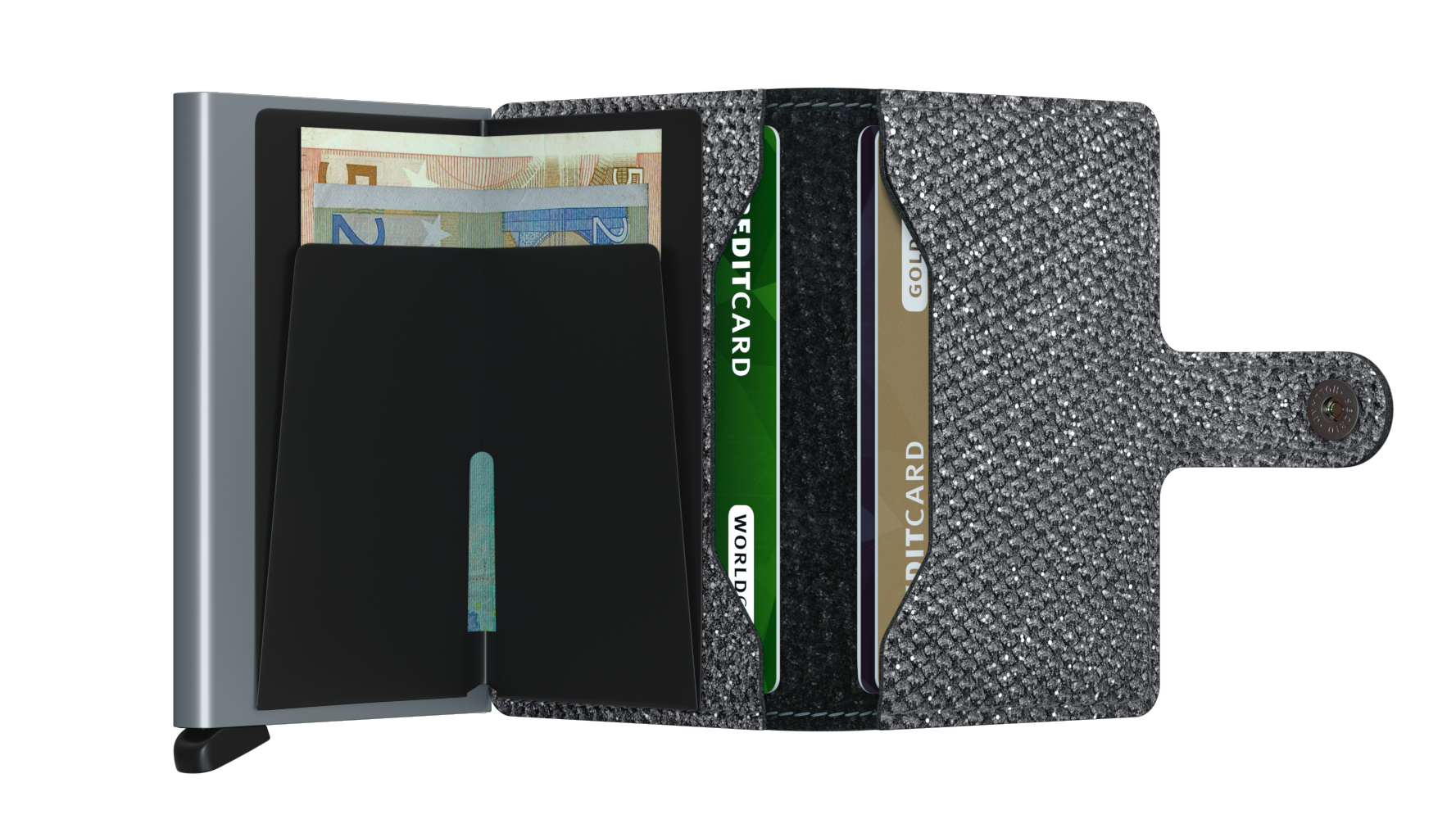 Petit par sa taille et étonnamment grand par sa capacité de stockage, le Miniwallet combine le meilleur des deux mondes. L'extérieur peut contenir des billets de banque, des reçus et des cartes, tandis que le Cardprotector en aluminium vous permet de faire sortir les cartes d'un simple mouvement et les protège contre pliures, cassures et les communications sans fil non désirées.