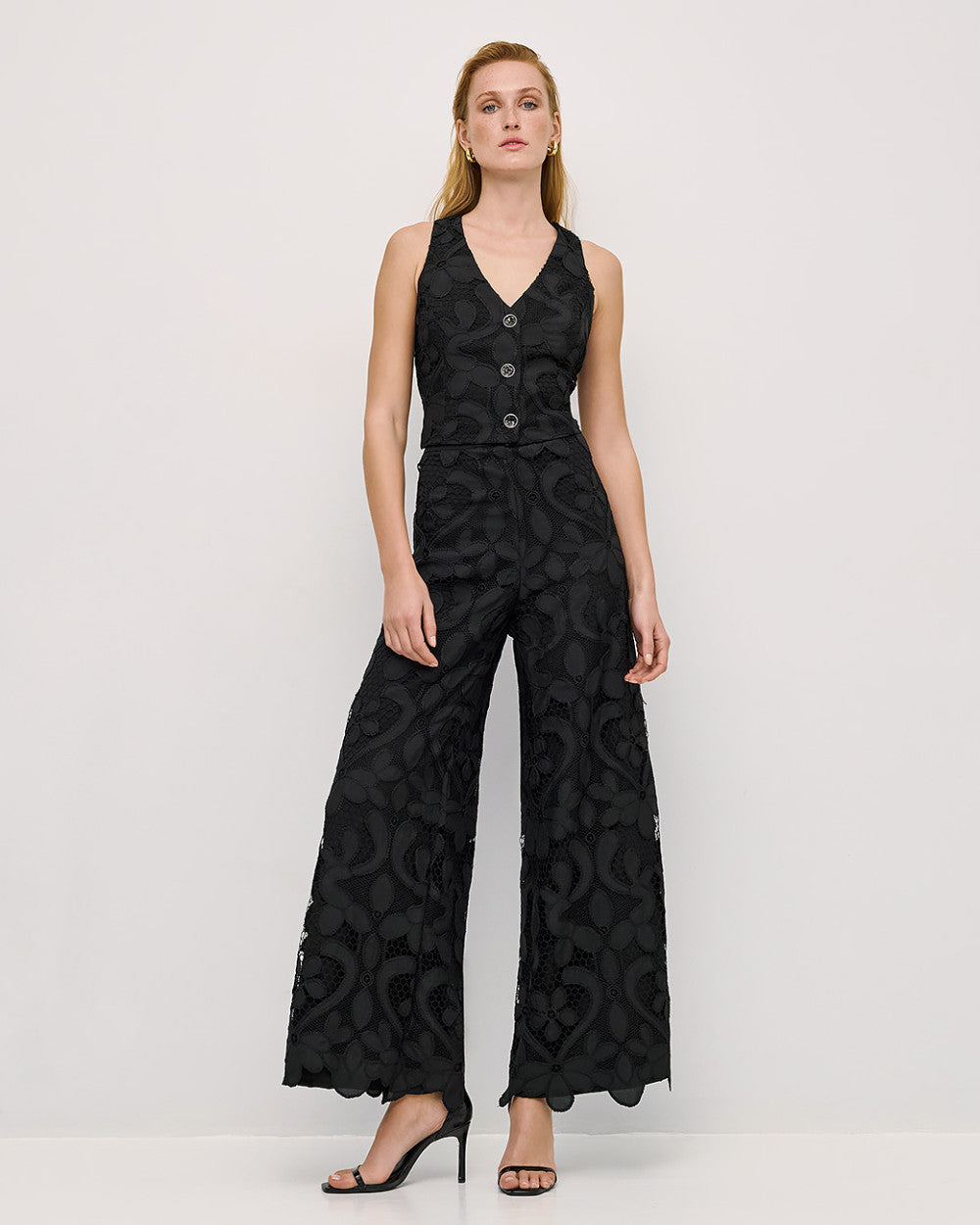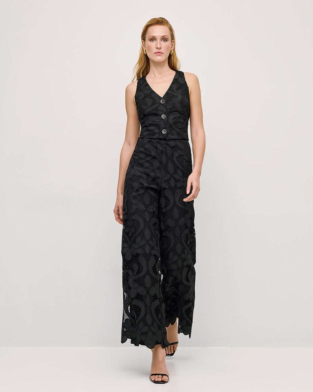 Optez pour une allure unique avec ce top façon gilet, orné de broderies raffinées. Sans manches et légèrement court, il présente une encolure en V et une fermeture boutonnée sur le devant. Portez-le avec le pantalon assorti de notre collection pour un look affirmé et harmonieux.