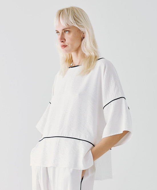 Misez sur une silhouette moderne et élégante avec cette blouse oversize aux détails contrastants. Elle se distingue par ses manches chauve-souris et son encolure bateau, offrant un tombé fluide et sophistiqué. Les fentes latérales et les finitions en passepoil ajoutent une touche contemporaine à cette pièce intemporelle.