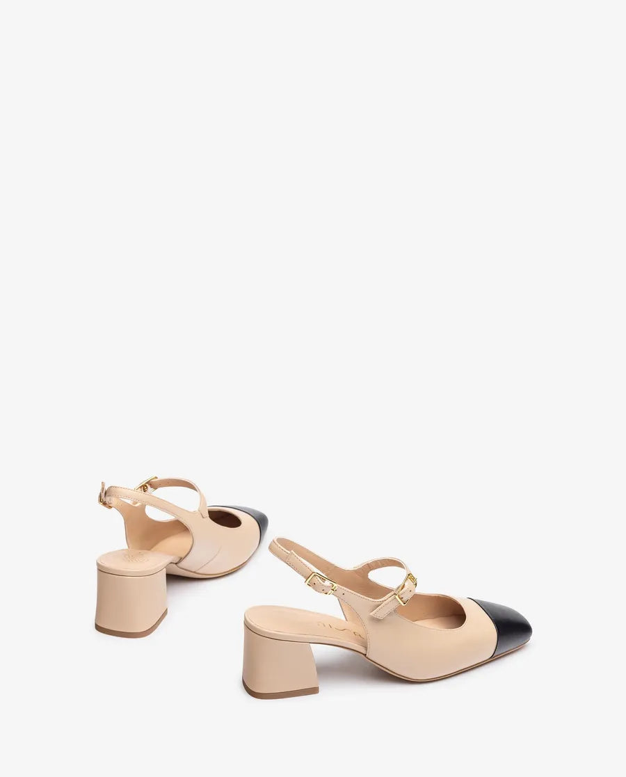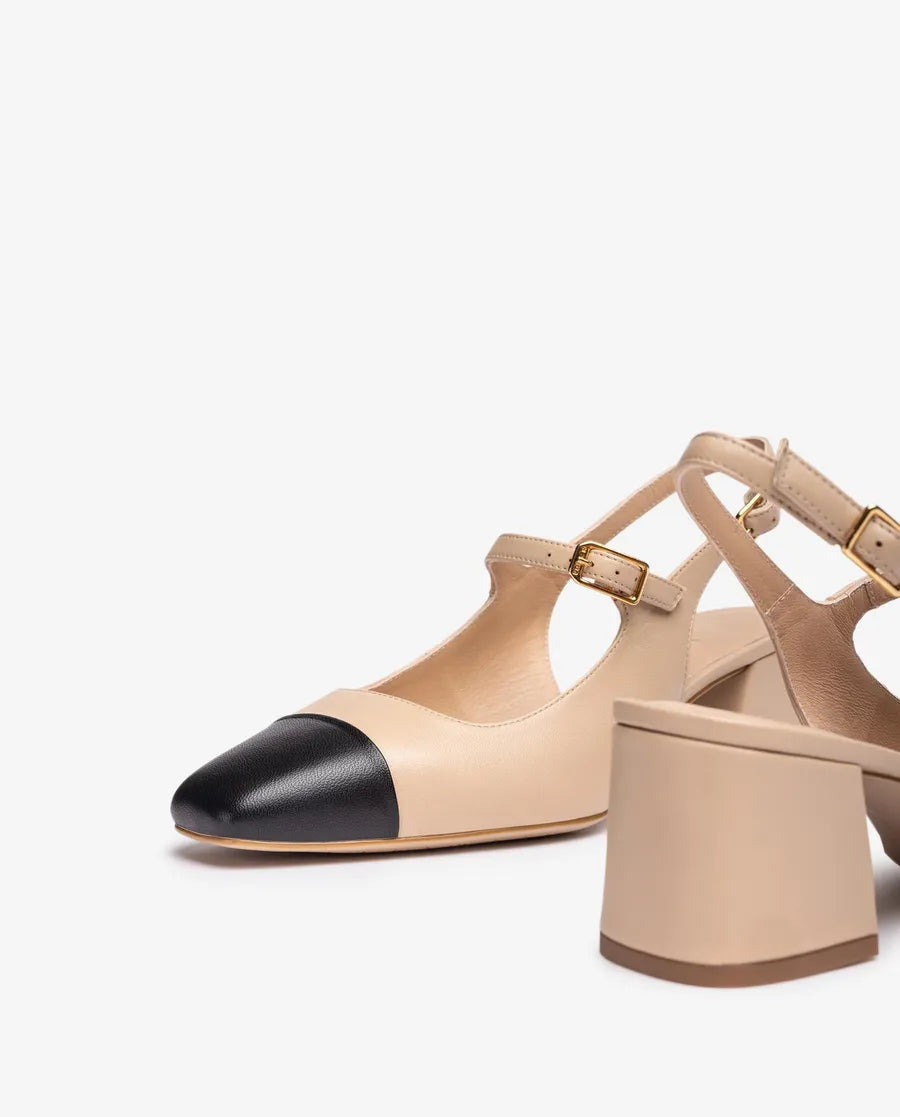 Ballerines avec bride à bout carré en cuir. Pointe en cuir noir contrastée Brides réglables avec boucle en métal sur le cou-de-pied et la cheville. Talon de 5,5cm de haut doublé en cuir. Semelle en caoutchouc léger, souple et antidérapant. Un modèle parfait au quotidien.
