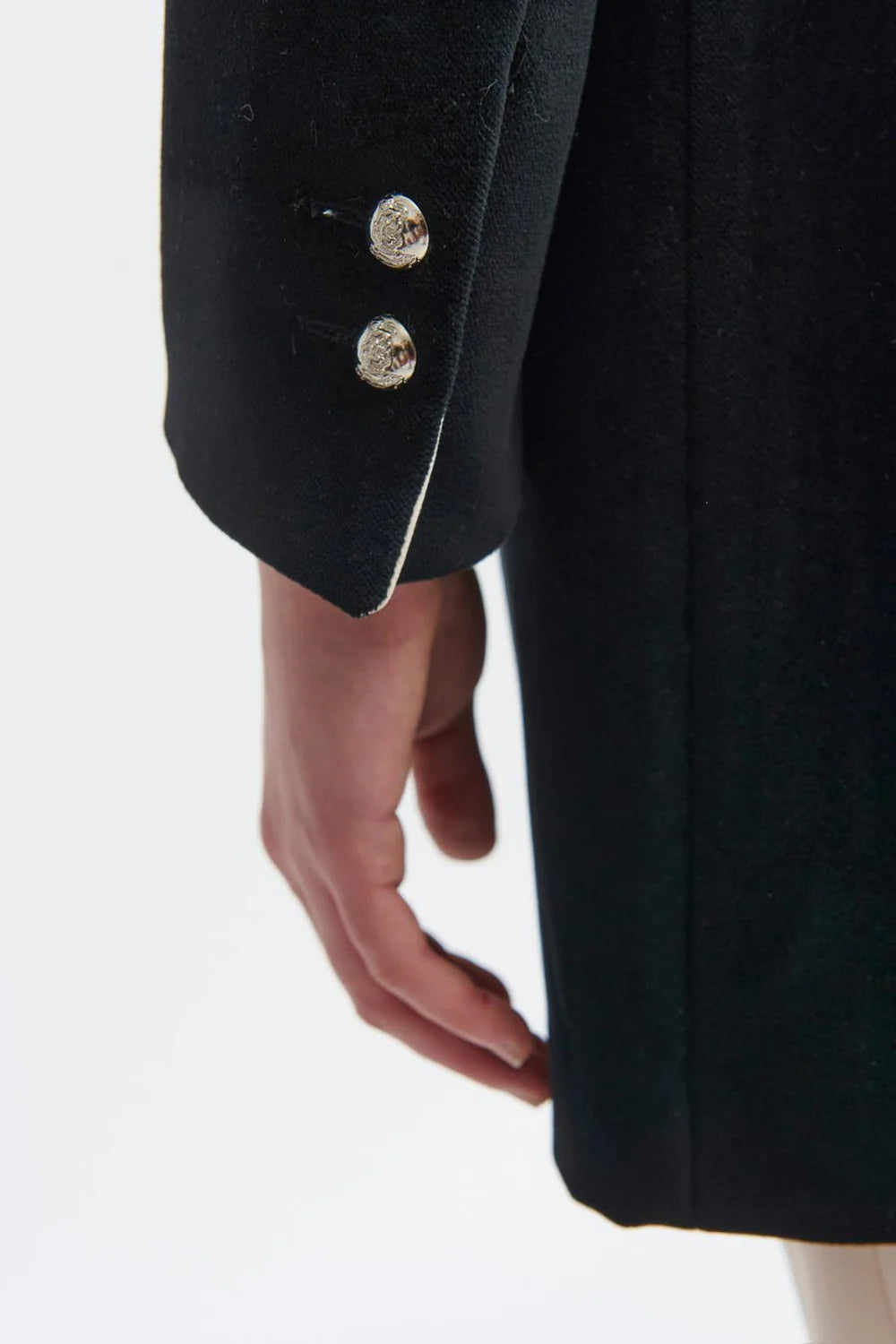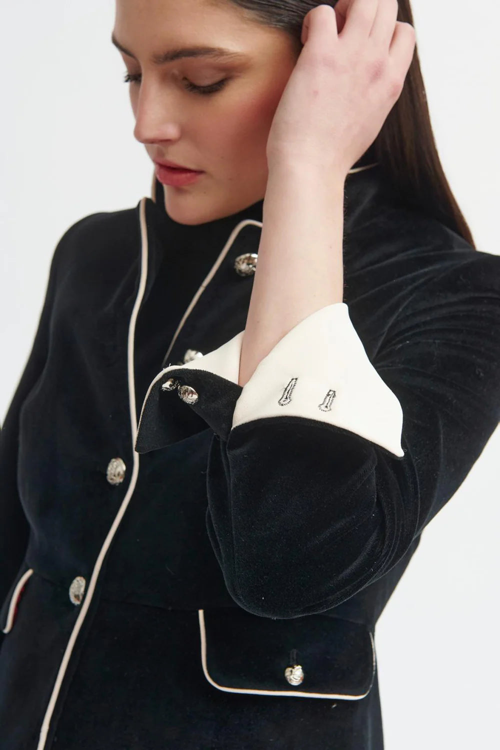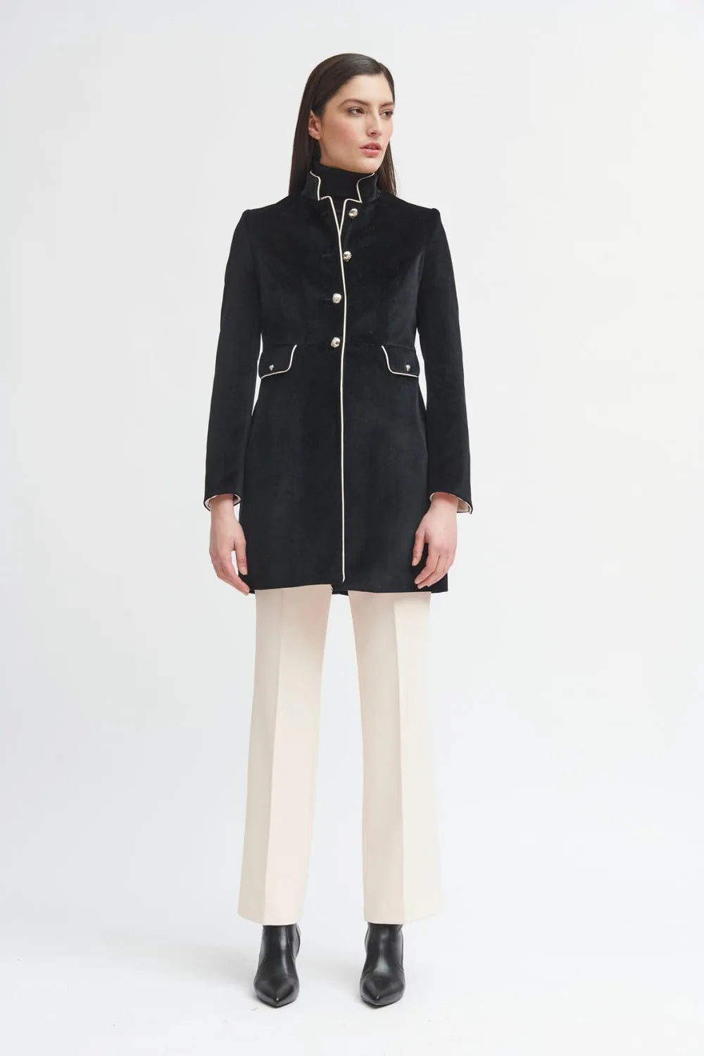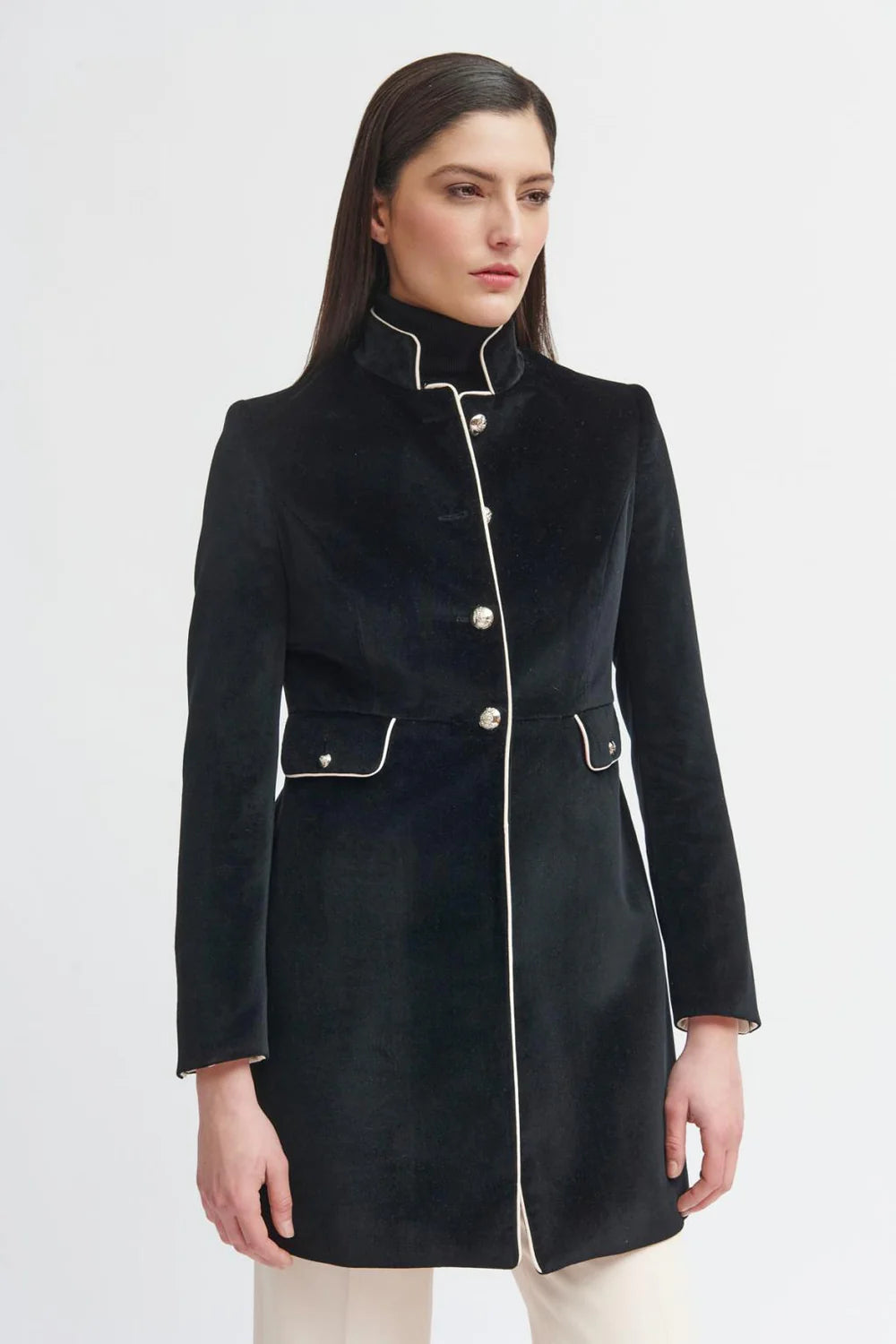 Veste américaine longue de style militaire.Tissu en velours. Col mao. Fermeture frontale avec boutons métalliques. Détail de passepoils contrastants. Fausse poche à rabat avec bouton métallique. Manches longues avec fermeture à deux boutons et revers contrastant. Ourlet droit sans fente.