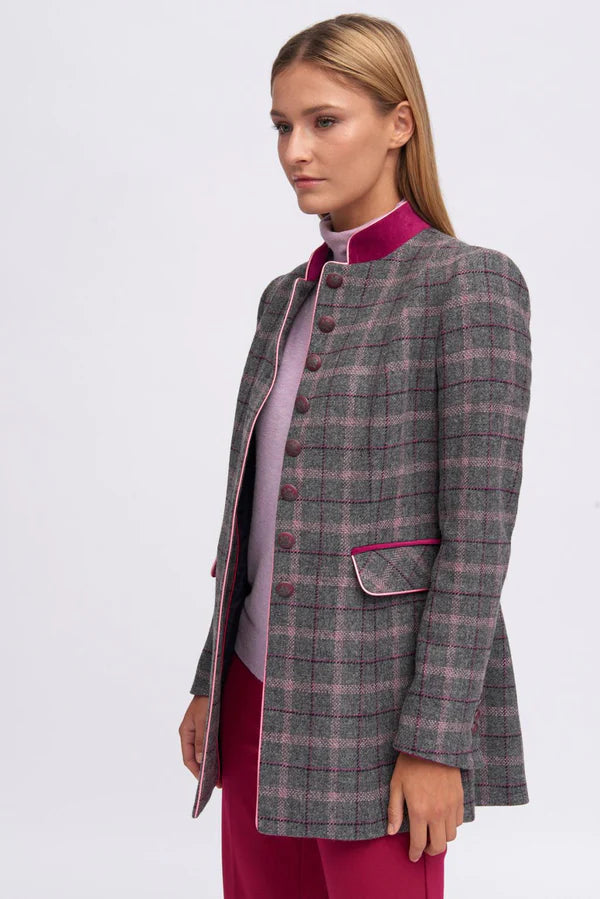 Veste longue de style militaire. Tissu tweed. Coupe droite. Col mao en velours lisse. Fermeture frontale avec des boutons métalliques en relief. Détails de bordures contrastées. Faux poches à rabat en velours. Manches longues avec fausse fermeture boutonnée et légère ouverture. Patte en velours dans le dos. Ourlet droit sans fentes. Doublure intérieure.