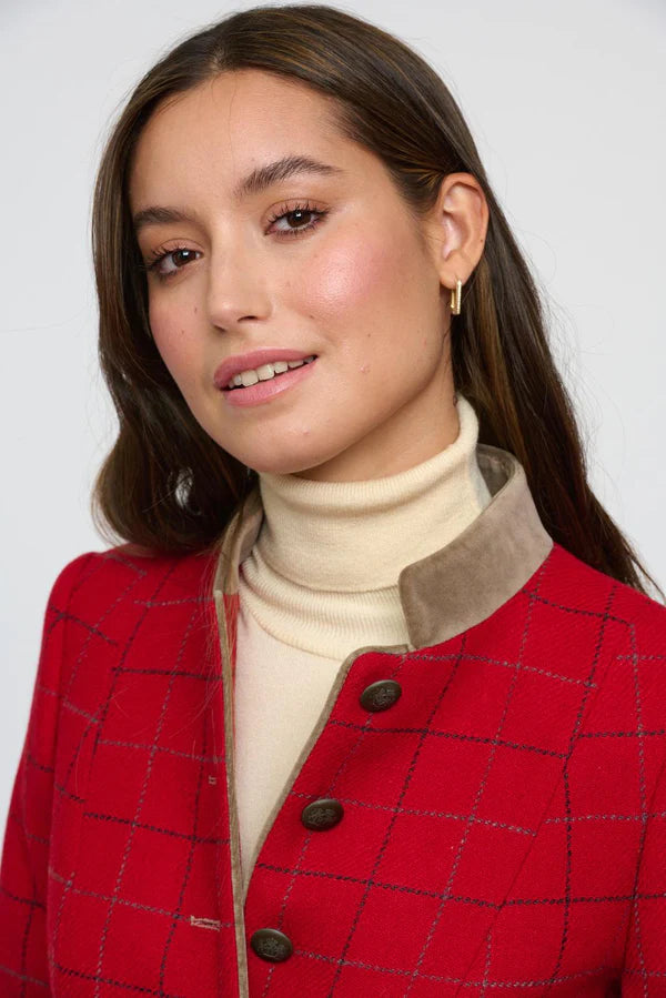 Veste américaine longue de style militaire. Tissu en tweed. Coupe droite. Col mao en velours lisse. Fermeture avant avec boutons métalliques en relief. Détails de passepoils en contraste. Poches à rabat en velours. Manches longues avec fausse fermeture boutonnée et légère fente. Passant en velours au dos. Ourlet droit sans fentes. Doublure intérieure.
